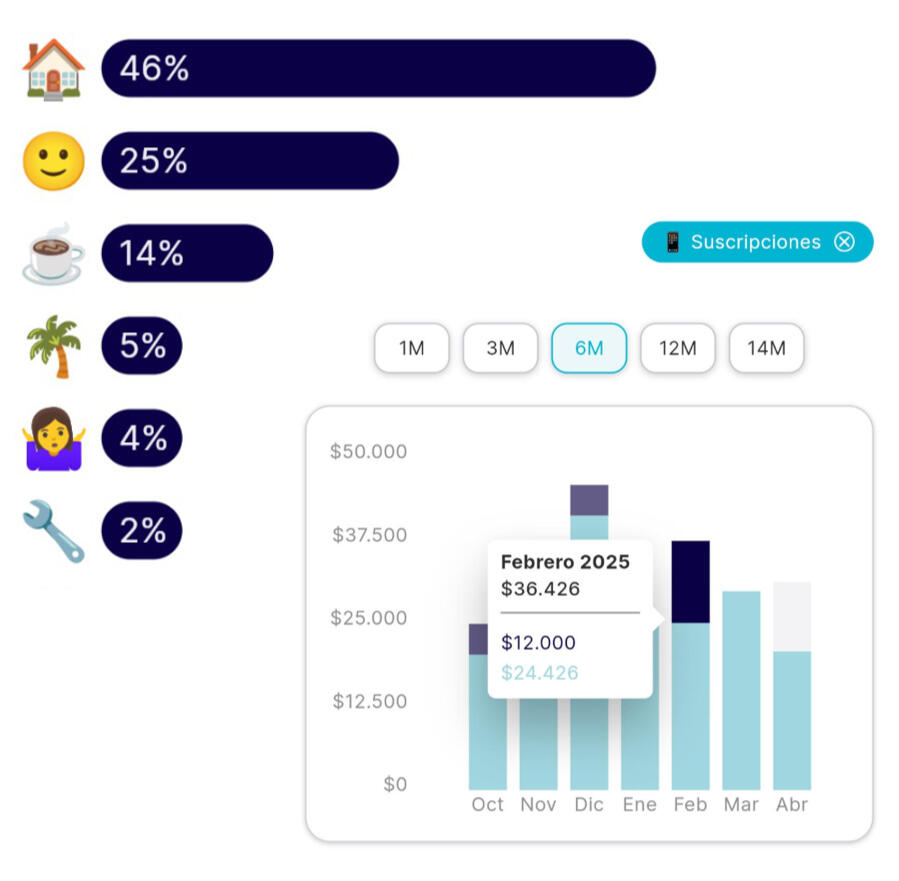 2. Reportes y Visualizaciones: Generamos resúmenes y gráficos para que revises tu historial de gastos, detectes patrones y veas tu evolución mes a mes.