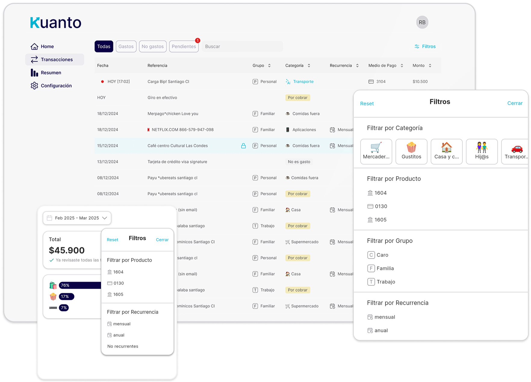 Kuanto es una app diseñada para ayudarte a organizar y categorizar tus gastos personales y familiares de forma simple y eficiente. Centraliza automáticamente tus transacciones desde diferentes medios de pago y cuentas bancarias, procesando correos relacionados con pagos, transferencias y cartolas bancarias enviados por el usuario.La App te ayuda a clasificar cada movimiento como “gasto”, “no gasto” o “por cobrar”. Además, no solo permite clasificar tus gastos en categorías y grupos (como personales, del hogar u otros), sino que también aprende de tus interacciones para automatizar este proceso con el tiempo. Además, ofrece herramientas para personalizar reglas de clasificación, exportar datos en formato Excel y analizar tus finanzas de manera visual con gráficos y otros elementos visuales.El objetivo de Kuanto es que tengas un control claro de tus finanzas dedicando pocos minutos al mes para establecer y categorizar tus gastos. Tenemos la visión de que, con esta información, las nuevas tecnologías nos permitirán desarrollar para ti agentes y herramientas que te entreguen hallazgos y recomendaciones concretas para ahorrar.